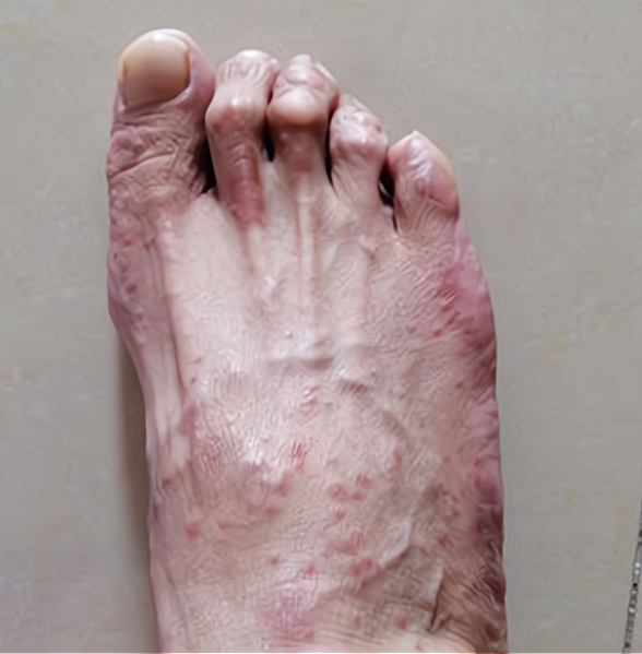 患者是一位面相慈祥、精神饱满的阿叔,通过询问了解到:患者自述自己患了“脚气病”5年之久,发病时瘙痒异常严重,尤其是在夜间睡觉时。自己也尝试了各种方式治疗,治疗后一段时间疾病会出现缓解,但是没过多久又会再犯。了解完具体情况后,我们开始对患者进行了专科查体,查体结果显示:患者双脚缝及双脚背存在散在皮疹,皮疹周围发红,中间有一股水泡,伴有鳞屑,瘙痒严重,皮疹面积占20%左右。